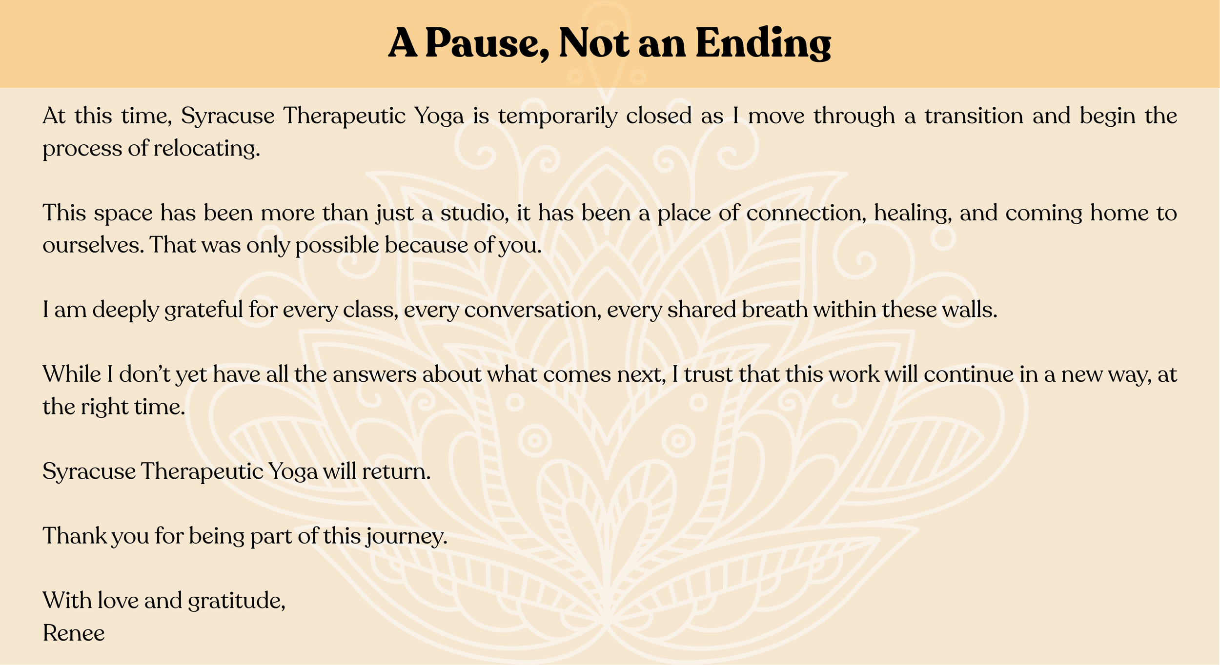 “The gentle yoga sessions at Syracuse Therapeutic Yoga are truly rejuvenating. As a person living with a chronic condition (Rheumatoid Arthritis), I appreciate the healing approach Renee uses to help comfort, strengthen and soothe my body! The meditation and therapy techniques also improve my mood and leave me feeling positive and refreshed!”